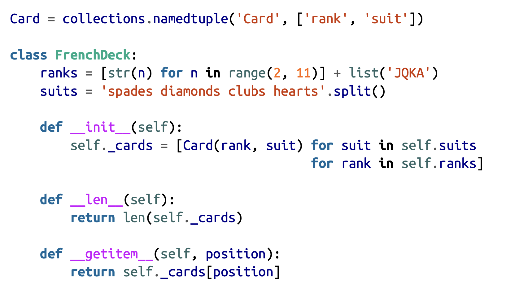The combination of namedtuple for cards and the sequence protocol for the deck shows the coolness of Python's data model: minimal, clear, and fully integrated with built-in operations.